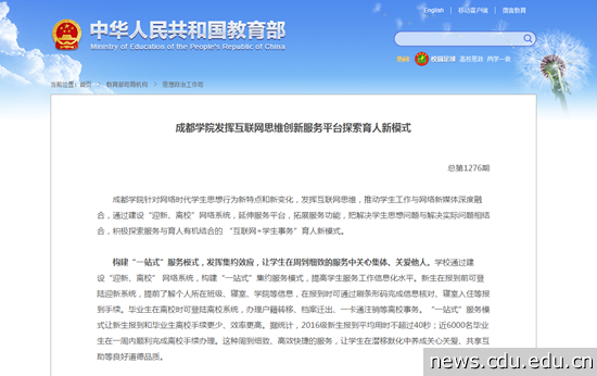 编者按:2016年12月30日教育部《加强和改进大学生思想政治教育工作简报》(总第1276期)以《成都学院发挥互联网思维创新服务平台探索育人新模式》为题,报道了我校服务与育人有机结合的 “互联网+学生事务”育人新模式。
