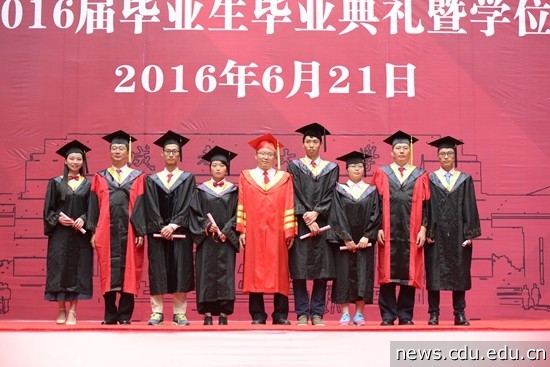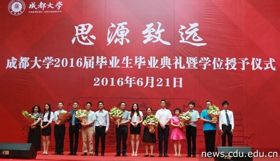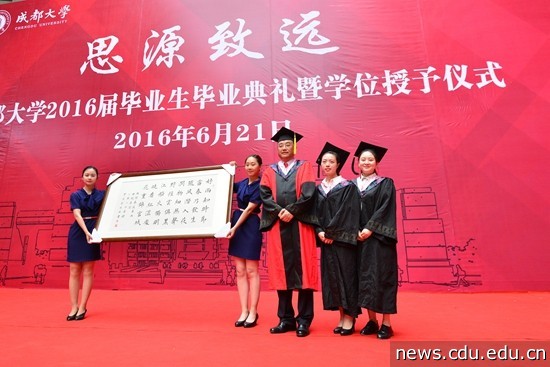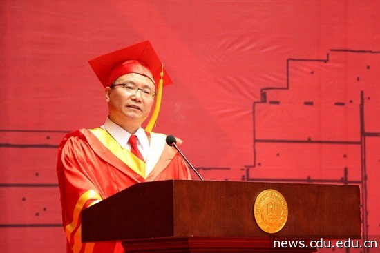 在热烈的掌声和欢呼声中,校长王清远为毕业生致辞。他代表学校向圆满完成学业的5871名毕业生表示热烈的祝贺!向辛勤劳动的全体教职员工表示崇高的敬意!向始终关注并支持同学们刻苦学习的各位家长和社会各界人士,表示衷心的感谢!他语重心长地说,今天是一次仪式性的告别,成大,留下同学们青春最初的梦想、拼搏和喜悦。你们当中,有学科竞赛的出类拔萃,有“快便当”,“掌上洗衣”的无限创意,有同寝室4人共同考取研究生的携手拼搏,有全国大学生艺术节的浓墨重彩,有出彩中国人的梦想绽放,有健身健美到令世界惊叹的成都女孩,带给我们多少的骄傲。在未来的日子里,希望大家承担更多责任,践行更多理想,用自己的行动去到达更有诗意的远方。因为对诗意的憧憬,我们为你们打造更人文、更智慧、更绿色的校园,因为对远方的期许,我们和你们一道策马扬鞭,为你们的青春和未来搭建更高平台。思源致远,我们的学校与国家的发展同频共振,我们共同见证大众创业万众创新的时代洪流。衷心希望所有毕业生,在日日的苟且中,还能拥有诗与远方;在追求诗与远方时,经营好日日的苟且;要保持开放的心灵,迎接远方的风景和眼前的苟且;希望一代代成大学子,都能带着求真务实、自强不息的成大精神和师生共同的血脉为我们的国家和民族尽一份力量。最后,王清远祝愿毕业生们在新的人生旅程中,乘风破浪、鹏程万里,到达精神、事业、人生的诗和远方。