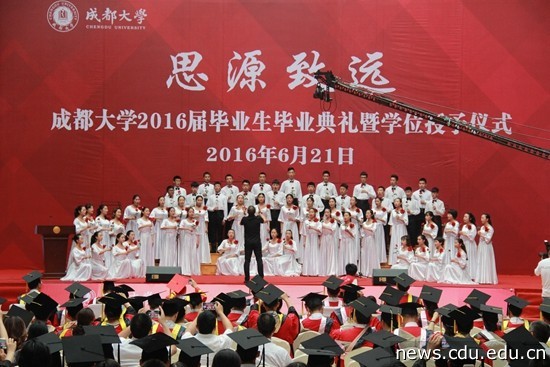 “心有多大,梦想就有多大”全体毕业生起立唱起《毕业歌》,唱出对母校不舍和依依留恋;“成大,我们共同的家,无论在哪里,我们一直与你同在”,微博墙的大屏幕上,时时滚动着同学们的祝福和感恩话语,“一直播”视频直播平台全程展现了仪式现场活动和师生们的感想感言;现场“大摇臂”掠过之处,毕业生们身着学士服,冲着镜头挥手、飞吻、自拍、泪流满面……