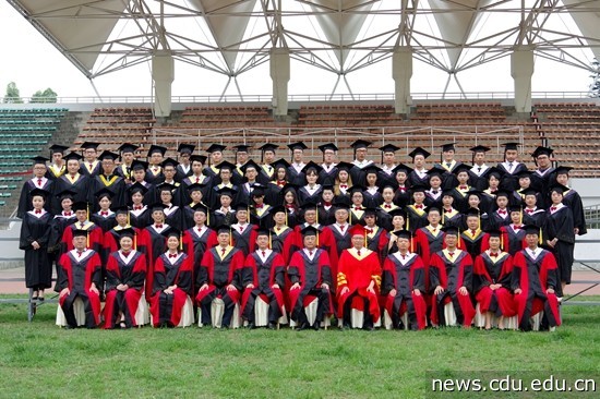 典礼结束后,校领导、学院学位评定委员会全体委员和现场全体毕业生在体育场合影留念。一道爱的弧形,一幅红、黑、绿点缀的“水墨画”,一张2500余名学子的毕业合影定格在美丽的成大校园,铭刻在每位毕业生的心中。