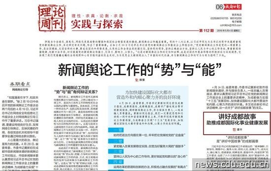 编者按:5月4日《成都日报》第6版(理论周刊)刊登文学与新闻传播学院院长谭平教授的《讲好成都故事 助推成都国际化事业健康发展》(http://www.cdrb.com.cn/html/2016-05/04/content_2301570.htm),文章认为要“讲好中国故事”的成都篇章,需仔细梳理这座伟大城市历史文化遗产;打造实力强大的能够实现媒体融合的国际传播专业机构;打造一支精通成都的历史文化与现代化国际化追求的复合型专门人才队伍,才能助推成都国际化事业的健康发展。全文转载如下: