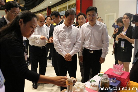 医学院师生代表以“互联网+医疗”为主题,聚焦“四川省健康科普基地”,展示了学生参与创业的“健康智能小屋”、学生自主创业的“羌药喷雾剂”、“速塑人工骨”、“膝关节康复天使”等项目。期间,省政协副主席陈放、省政府副秘书长罗治平等省市级领导莅临指导并重点关注和详细询问了“羌药喷雾剂”和“速塑人工骨”项目。创新创业指导老师王战国博士对其项目的产生、项目产品研究、项目产品优势进行了详细解说。陈放频频点头,并给予了充分肯定。