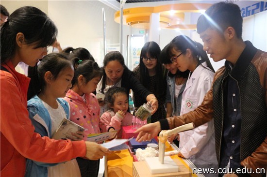 本网消息(文/万君 图/黄祥琳)5月14日,“2016年四川省暨成都市科技活动周”启动仪式在成都国际非物质文化遗产博览园拉开帷幕。本次活动由四川省人民政府主办,成都市人民政府、四川省科技活动周组委会承办。10所在蓉高校、64家企事业单位参与活动,科普主题展示体验活动分为“创新之光”、“双创园地”、“未来之星”、“科普传承”、“创新分享”、“科普传播”六大主题区域。菁蓉学院、医学院(护理学院)师生代表学校参加展出。