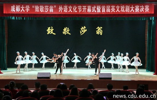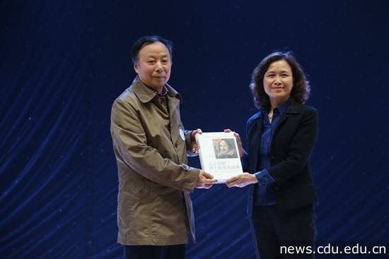 下午2:30,“致敬莎翁”外语文化节开幕式暨英语戏剧大赛正式开始。副校长苏蓉为外语文化节开幕致辞。副校长彭晓琳宣布外语文化节正式开幕。中国莎士比亚研究会副会长、国际莎学通讯委员会委员、莎士比亚研究所所长、重庆市社会科学专家库专家、四川外国语大学教授李伟民应邀出席活动,他向学校赠送了《英汉双解莎士比亚大词典》和《中国莎士比亚研究》。