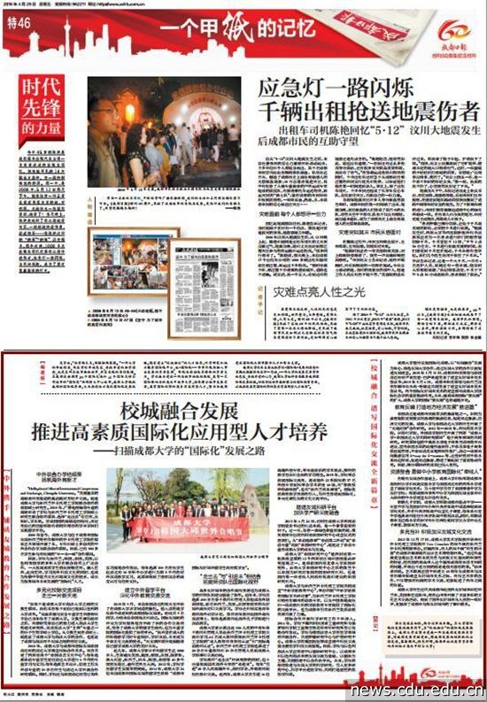 2016年4月29日,《成都日报》报庆60周年特刊第46版(总第66版)以《校城融合发展 推进高素质国际化应用型人才培养》为题,半版报道了我校国际化发展之路,扫描了学校对外合作与交流的基本情况,展示了“校城融合”下为服务成都地方经济文化所作出的贡献。