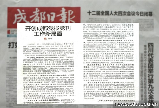 2016年3月16日,《成都日报》第6版“理论·周刊”版刊发我校文学与新闻传播学院院长谭平文章《开创成都党报党刊工作新局面》,谈成都的党报党刊如何贯彻落实习近平总书记2月19日讲话精神,发挥好党和人民喉舌作用,服务好地方经济建设和社会发展。原文如下: