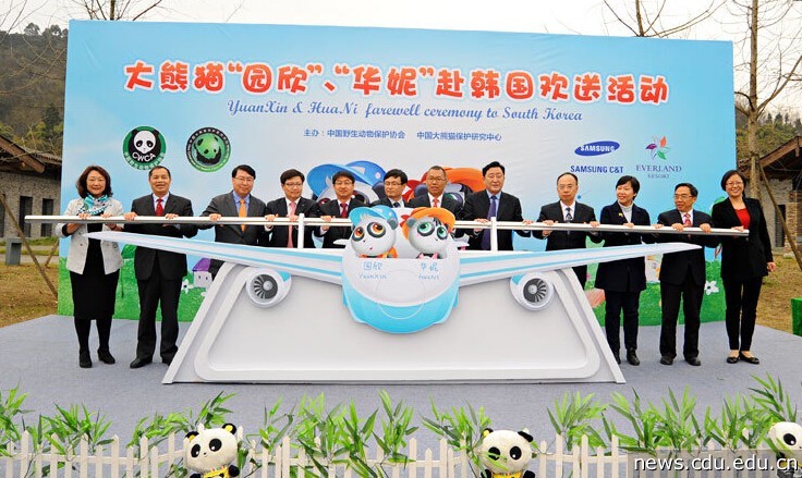 本网消息(文/宋贞子 西苑) 日前,温馨而又热烈的大熊猫“园欣”、“华妮”赴韩国欢送活动在中国大熊猫保护研究中心都江堰基地举行。国家林业局野生动物保护与自然保护区管理司、国际合作司、中国野生动物保护协会、四川省林业厅、都江堰市政府、中国大熊猫保护研究中心等单位的相关领导、专家,以及韩国驻成都总领事馆、三星爱宝乐园、大韩航空相关负责人等齐聚一堂,共同见证大熊猫“园欣”和“华妮”正式启程赴韩国定居。