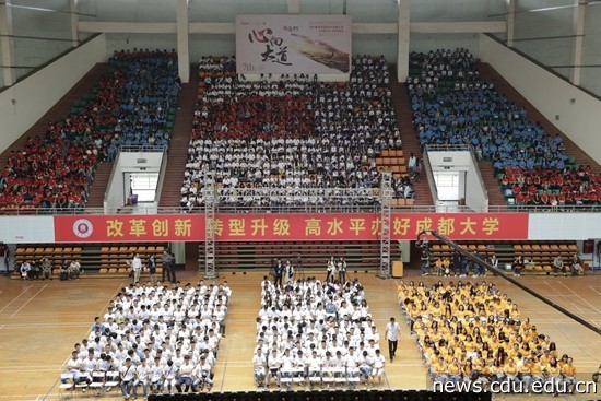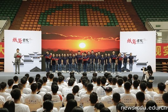 本网消息(文/启金 图/简易)9月24日下午,在中共成都市委宣传部指导下,纸鸢书院第七话《心向大道》大型读书分享交流会在我校体育馆隆重举行,畅销“红色书籍”《大道之行》作者、清华大学博士、“圆明园学者”获得者鄢一龙与我校1600余名师生一道分享和交流了对坚持走中国特色社会主义会“大道”的认识和感悟。市委宣传部副巡视员唐学、我校党委副书记宋辉出席现场活动。活动由成都电视台承办,知名主持人张毅担纲主持。