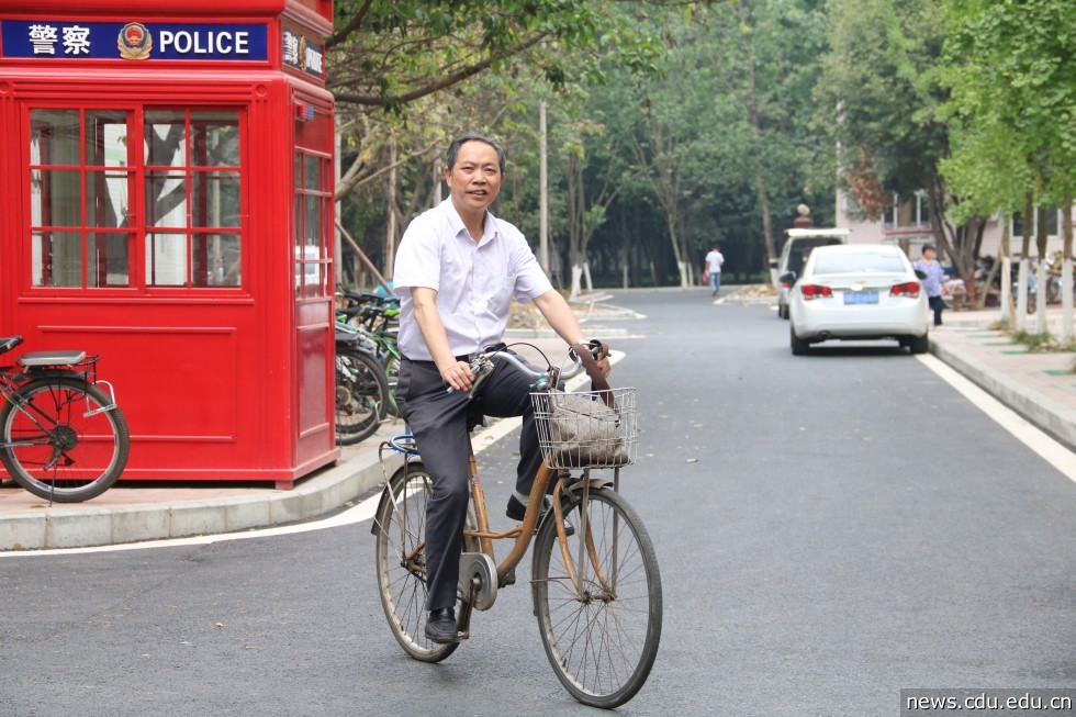 “老张”爱笑,现在他每天依旧骑着他的“老伙计”自行车在宿舍周边、校园各处穿梭,巡查宿舍安全、消防设施,处理宿舍卫生、学生投诉。这辆自行车陪他工作了十五年了,链条坏了,就换一根;轮胎爆了,再去配一个,老伙计也见证了他与学生之间的故事。