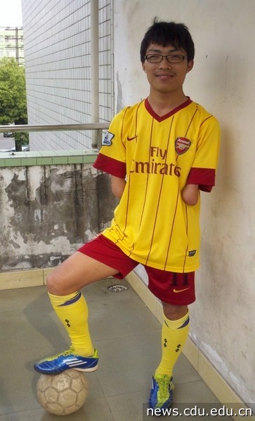 足球场上,没有双前臂的蔡阳的身影格外引人注目,课堂上,创新工作室里、家教中心,他和一名普通大学生没的什么区别,他说:自己的大学生活简单而充实。