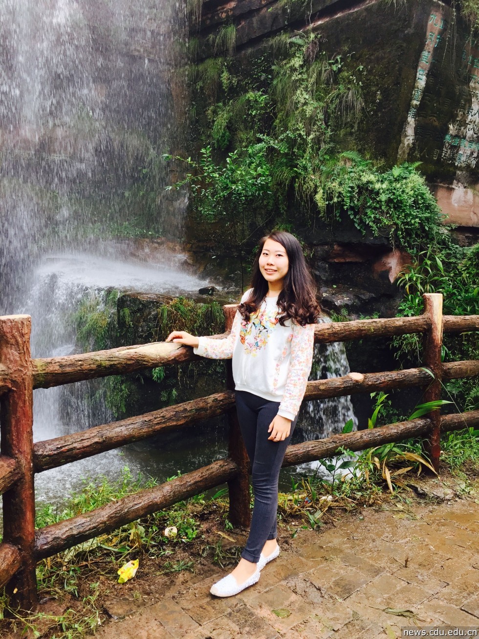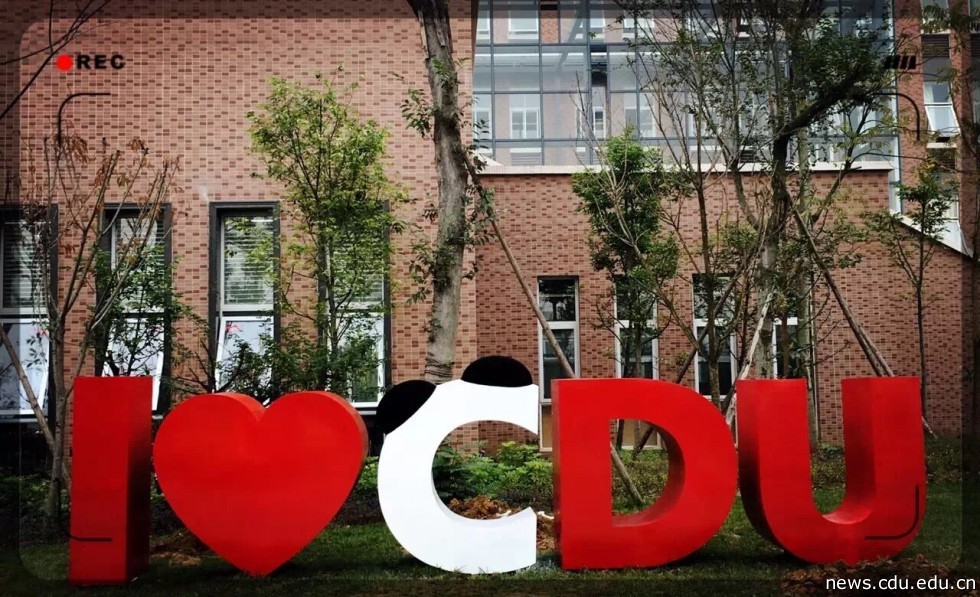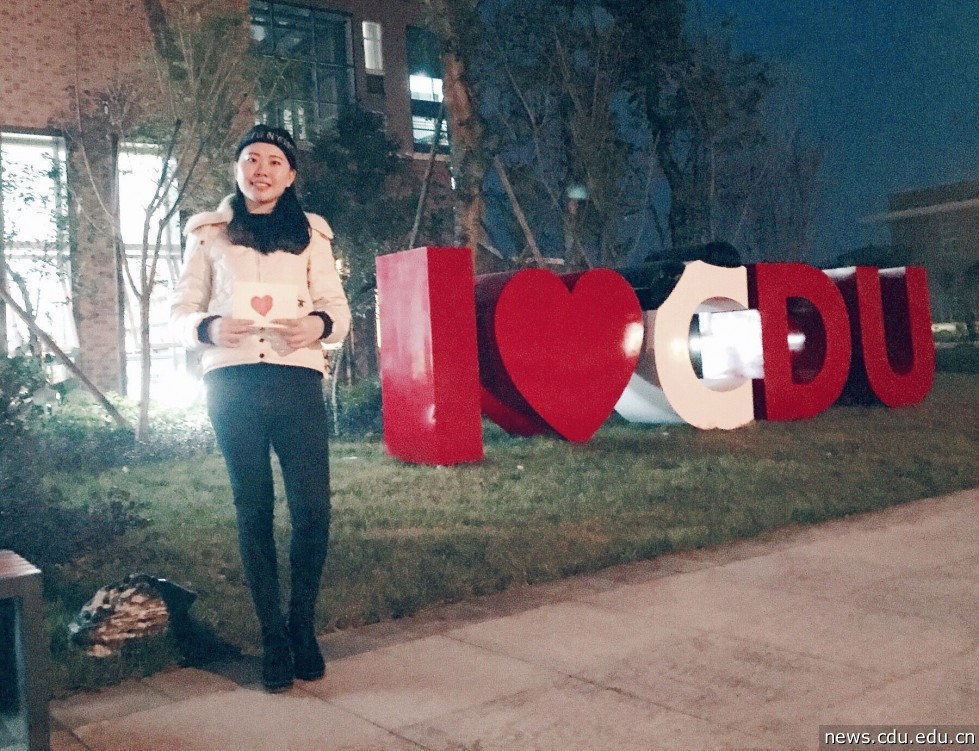 近期,校园里的I love CDU 雕塑落成了,而这个雕塑与她紧密相关,她是薛婉露,她也正是在2014年11月学校视觉识别系统设计方案征集活动中的夺魁者,如今,她设计的含有可爱的熊猫元素的CDU被广泛应用在学校的文化衫、笔记本,形象标识上……