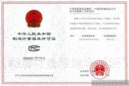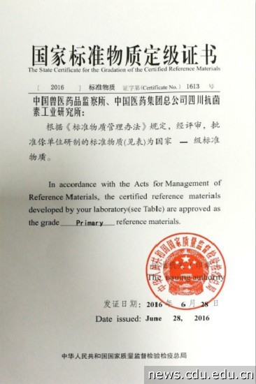 根据《中华人民共和国计量法》和《标准物质管理办法》的规定,川抗所提供的羟基地美硝唑标准物质达到计量法制管理考核标准和国家一级标准物质标准,准确度具有国内最高水平。该证书系川抗所首次获得国家标准物质证书,标志着所制备的羟基地美硝唑标准物质达到国际上同类标准物质的先进水平。