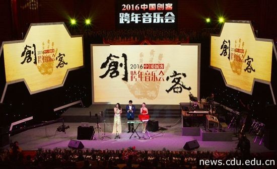 本网消息(文/骐骥 图/席原)2015年12月31日晚,中国首场以“文演创客”为主体的跨年音乐会在成都娇子音乐厅隆重举行。本次跨年音乐会由成都演艺集团、华西都市报、鸣仁资本、腾讯网与我校共同联合举办。市长助理、校党委书记毛志雄代表主办方会见了出席本次音乐会的嘉宾,包括韩国著名经纪公司代表、亚洲金牌经纪人、著名音乐制作人等演艺界权威人士。校长王清远、副校长彭晓琳出席了活动。在充满激情与梦想的视听盛宴中,十大文演创客、72家投资机构和千名观众共同打造了一场弘扬创客精神、充满“双创”正能量的跨年盛典。
