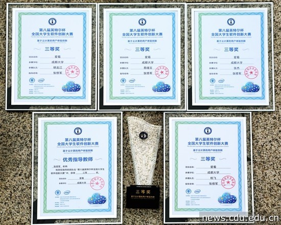 本网消息(文/张修军 图/简易)11月15日,由全国大学生软件创新大赛组织委员会、教育部高等学校软件专业教学指导委员会、示范性软件学院联盟主办的第八届英特尔杯全国大学生软件创新大赛闭幕式暨颁奖典礼,在天津大学北洋园校区郑东图书馆举行。我校信息科学与工程学院ICAN(爱看)团队的“将智能手机与智能电视相结合的服务于空巢老人”项目”荣获第八届英特尔杯全国大学生软件创新大赛国家级三等奖。