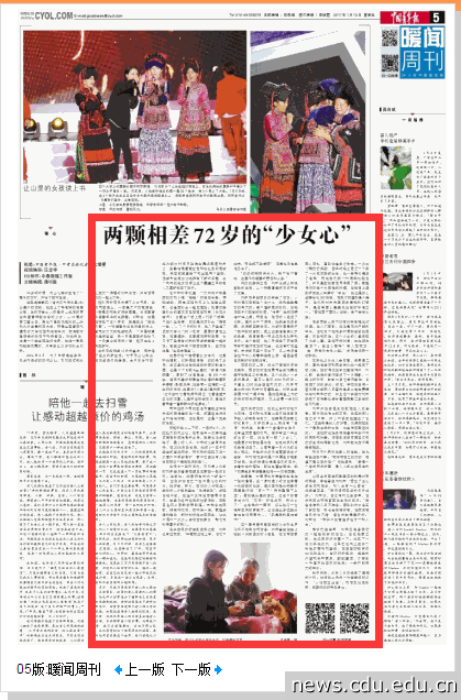 编者:2017年1月13日出版的《中国青年报》第5版“暖文周刊”,以《两颗相差72岁的“少女心”》为题报道了我校学子刘琳带着奶奶上大学的感人事迹。此次,《中国青年报》还一并推出H5和视频报道,以全媒体形式全景展现了两个祖孙室友间的动人故事。《中国青年报》、中青报官网“中青在线”、中国青年报客户端、中青在线多终端刊载报道。