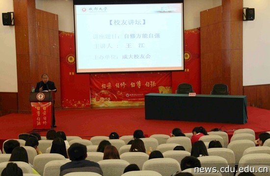 他认为:自修就如自善,是对自身各方面的完善;而自强就是要坚忍不拔、不屈不挠。拥有这些品质,成功就不会是难事。他说,成大校址从早期的花圃路到后来的荷花池,成大人见证了两大市场的崛起与发展(城隍庙电子市场和荷花池市场)。他自认为是幸运的一代,由于特殊的地理环境和时代背景,让他作为学生能直接感受时代跳动的脉搏和早期市场经济的发展,也通过老师的引导学习了大量的文史资料、毛泽东选集。20岁专科毕业后,王江当了几年教师,教学中秉承着成大交给自己的东西,度过了自己朴实的教学生涯,他很感激母校。王江学长从自修到自强的人生故事,对在校学子有着很大的激励。