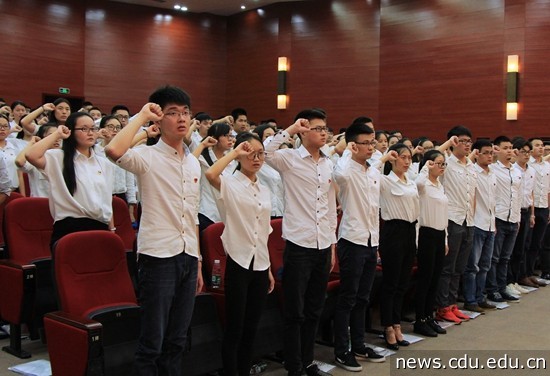 7月1日下午,气势磅礴、坚定有力的入党宣誓誓言在我校学生活动中心演播厅回荡。这是我校新加入中国共产党的422名大学生党员右手紧握拳头在鲜艳的党旗下,庄严地许下承诺,表达了热爱党、忠于党、准备为共产主义奋斗终身的决心和愿望。
