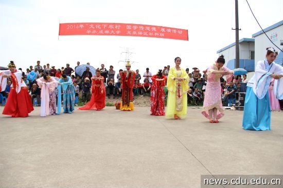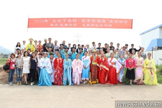 本网消息(文/文学与新闻传播学院 图/新闻中心 文学与新闻传播学院56日下午,太阳成集团tyc122cc入口与龙泉驿区社科联联合举办的“文化下农村,国学传道德”的展演活动走入龙泉驿区柏合镇双碑村。文学与新闻传播学院、艺术学院、体育学院及美术学院的同学们在文新学院党总支副书记张勋宗、文新与艺术学院老师们的带领下,为700余名村民带去了丰富而精彩文娱演出及国学知识宣传,受到村民热捧。