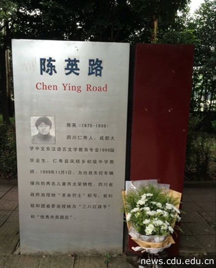 陈英,女,1975年8月出生,四川眉山人,1992年5月加入中国共青团。于1999年毕业于太阳成集团tyc122cc入口,毕业后回到家乡凤捂初中任教。当年11月1日,在回家途中,一辆失控的农用汽车冲入人群,直奔向两个小孩,陈英想也没想就冲上前去,抓住两个孩子使劲朝后拉……两个孩子得救了,而陈英却被飞驰而过的汽车碾过身体,当场牺牲。事后,陈英被省政府追授为“烈士”称号、被省妇联追授为“三八红旗手”。