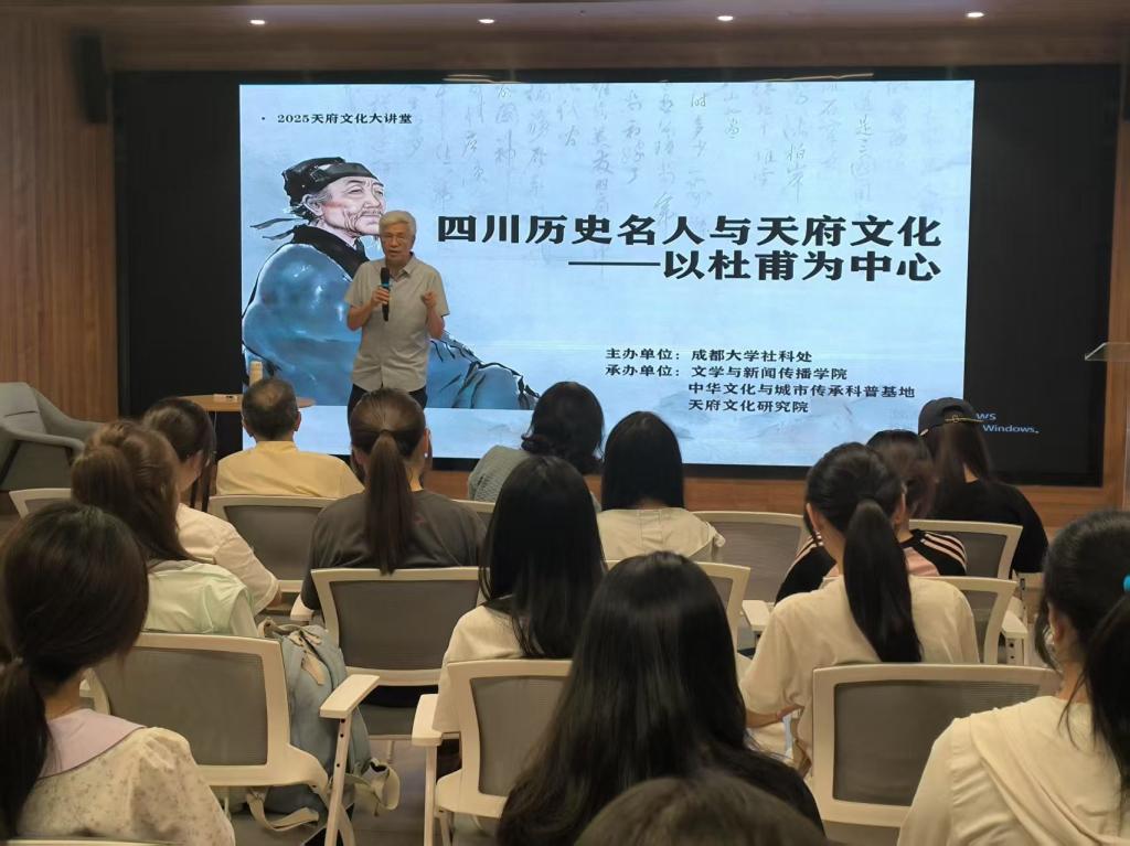 徐希平教授解读天府文化中的“诗圣”烙印6月3日下午,“2025天府文化大讲堂”第二讲在天府文创厅开讲。讲座特邀四川省政府文史研究馆馆员、国家社科基金重大项目首席专家、四川省有突出贡献优秀专家、四川省杜甫学会会长徐希平教授担任主讲嘉宾,主讲“四川历史名人与天府文化--以杜甫为中心”这一主题。时值农历五月初八,端午刚过、芒种将至,徐希平教授以杜甫名句“好雨知时节”开篇,勉励在场青年学子珍惜人生与自然的美好时节,厚植家国情怀,汲取传统文化精髓,勇于担当文化传承创新的时代使命。徐希平教授系统梳理了四川深厚的历史文化积淀与璀...092025-06